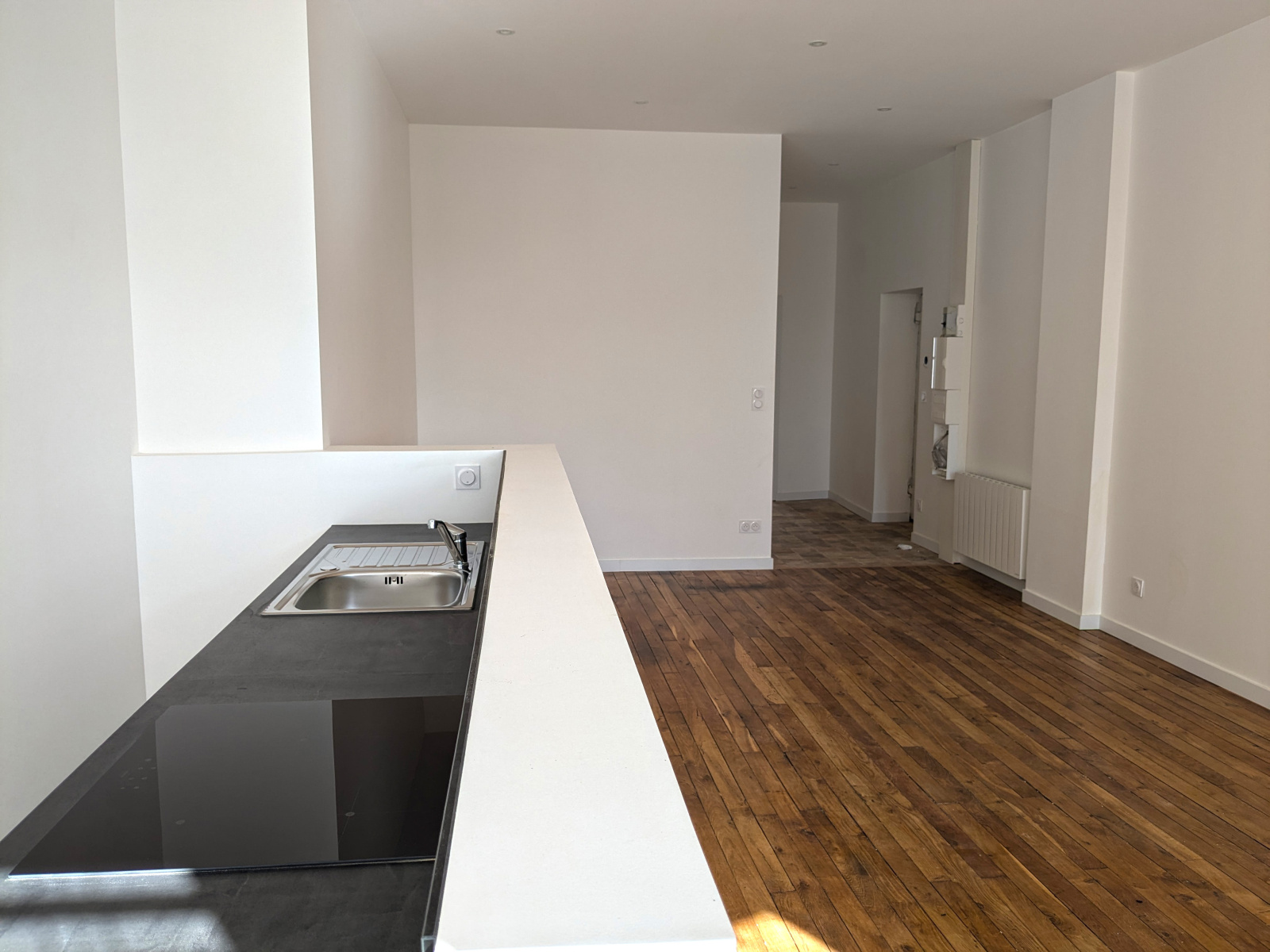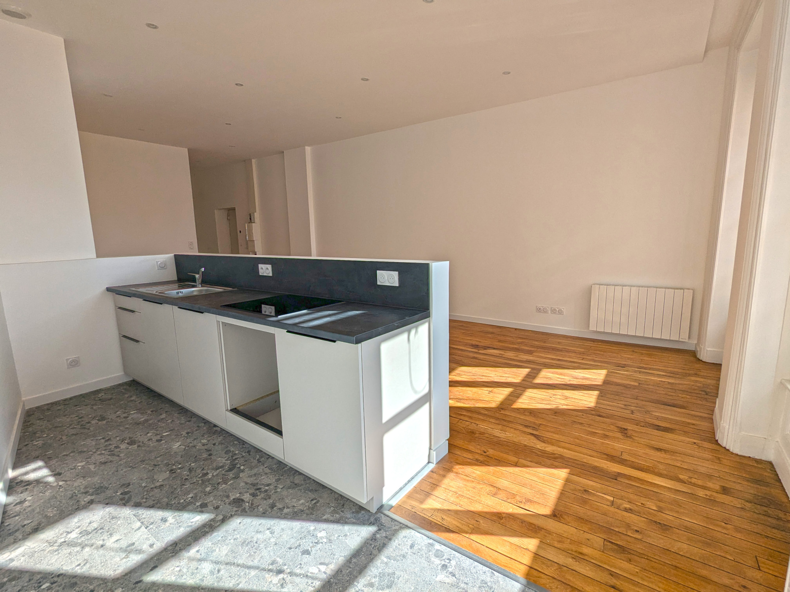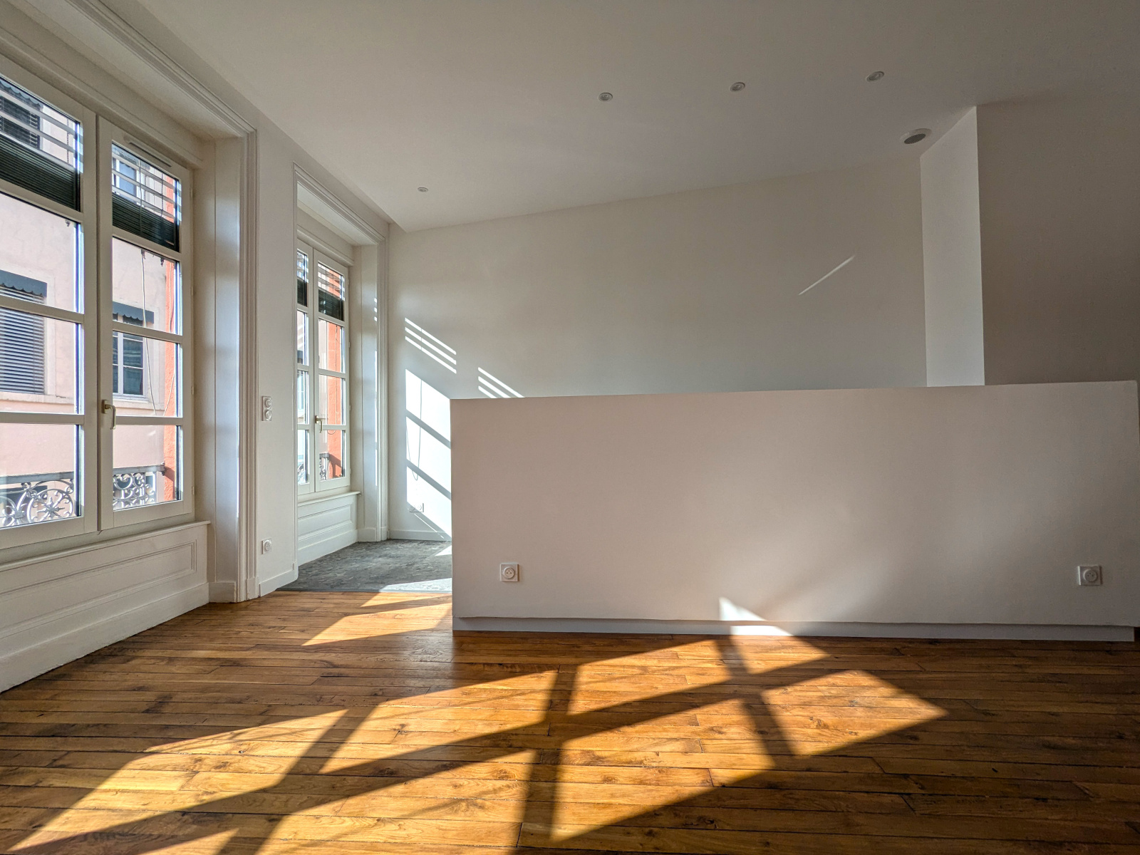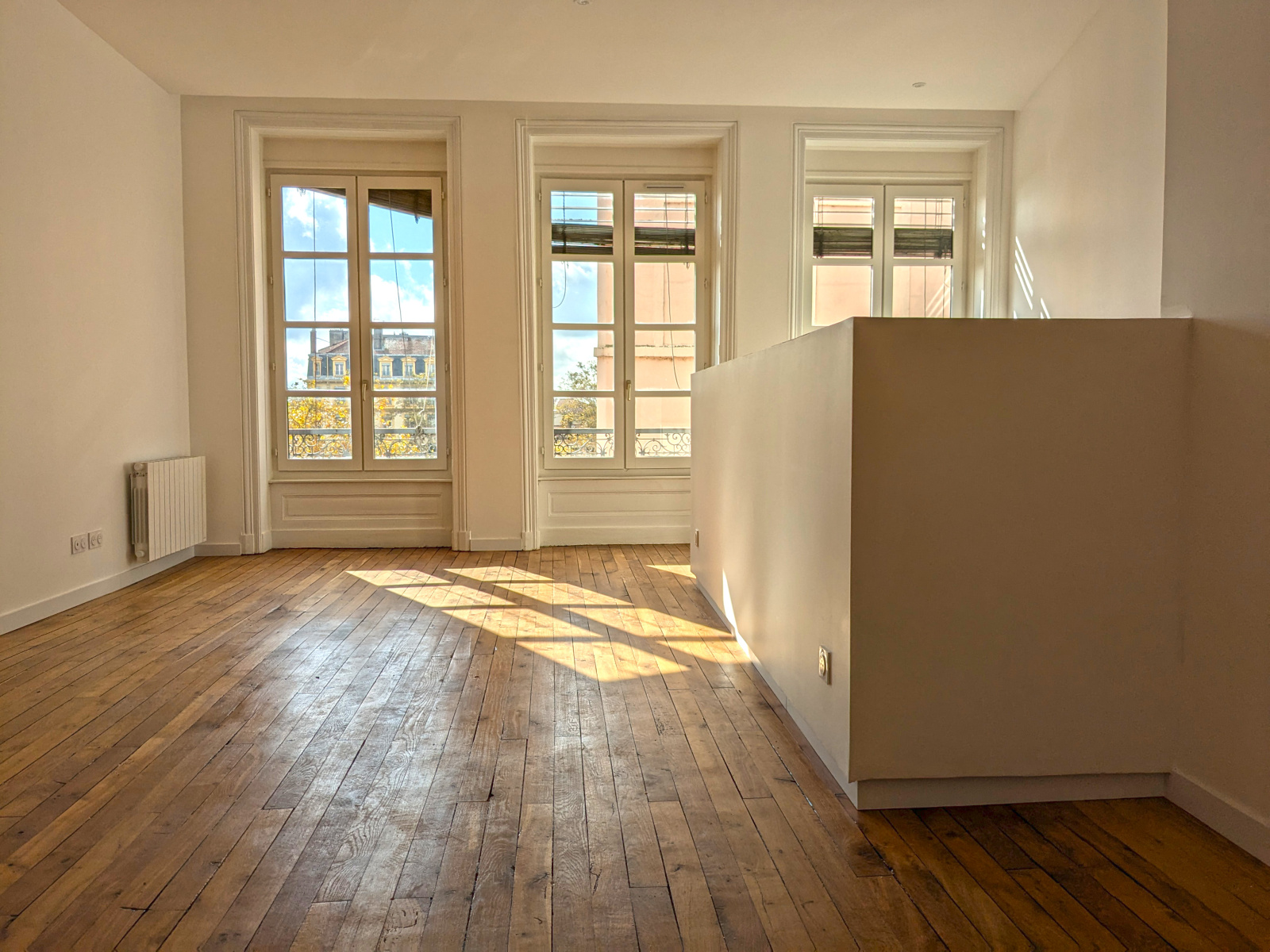 Passé l’entrée et son sol en tomette, vous accédez à la grande pièce de vie de plus de 34 m², avec espace cuisine ouverte dédié. L’ensemble est très lumineux, grâce à ses 3 grandes fenêtres orientées Sud sur la place de la Croix Rousse.