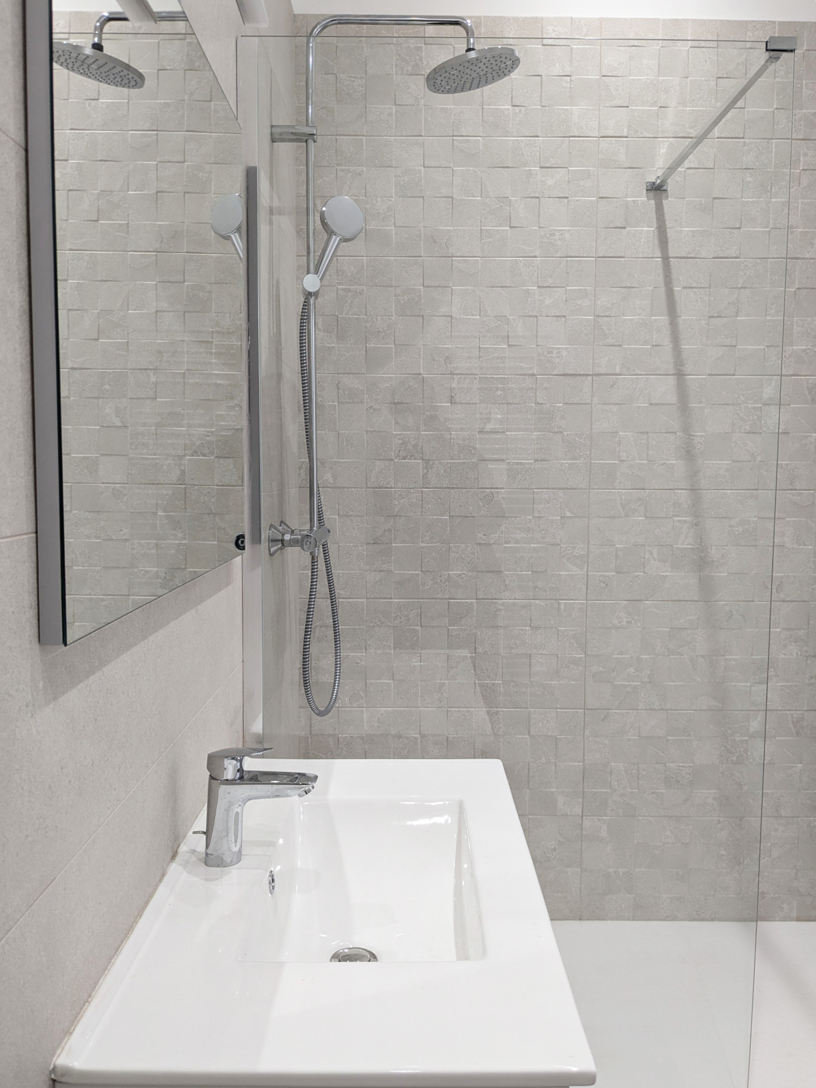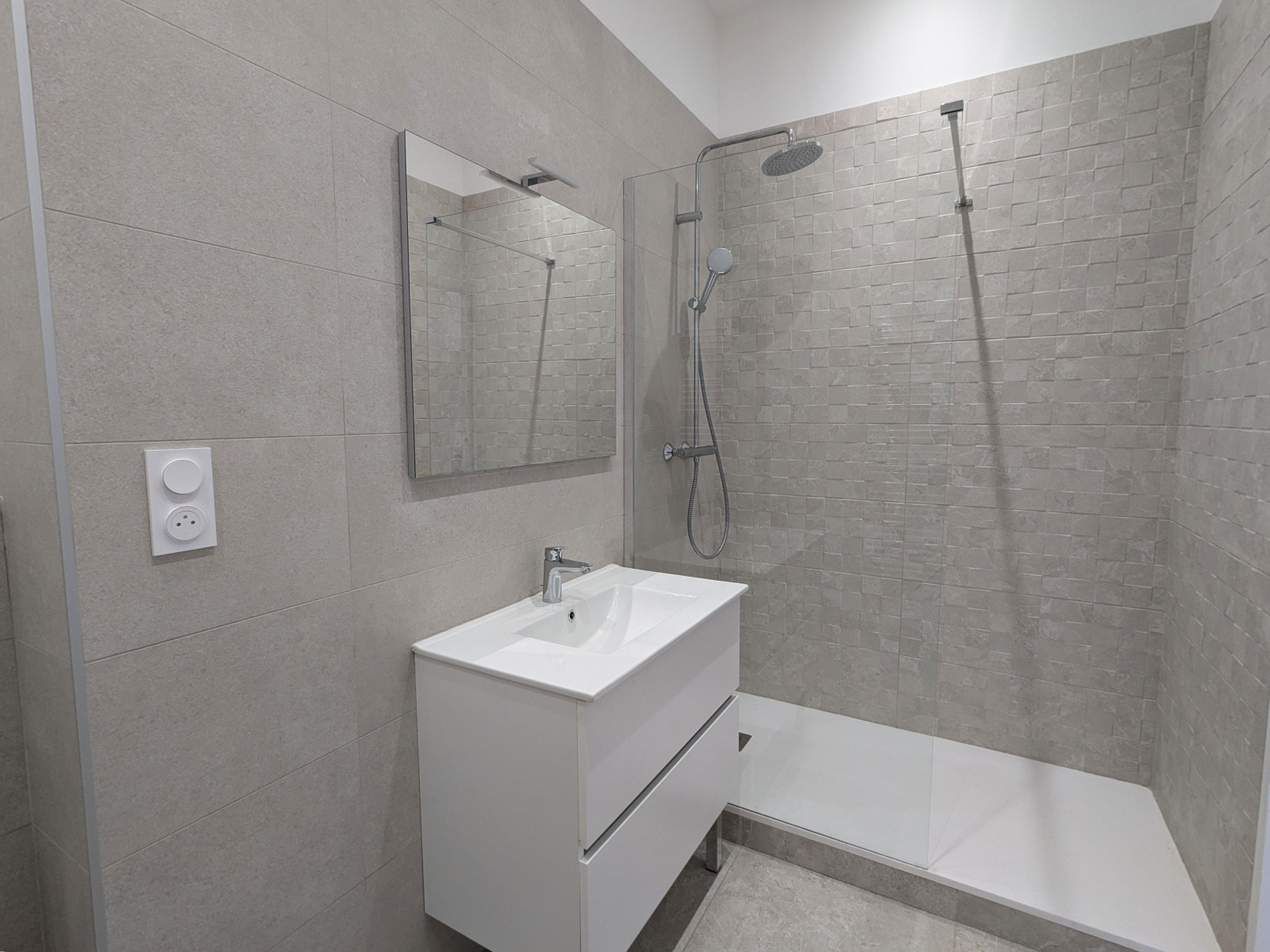 La salle d’eau avec douche à l’italienne, emplacement machine à laver accueille les toilettes.