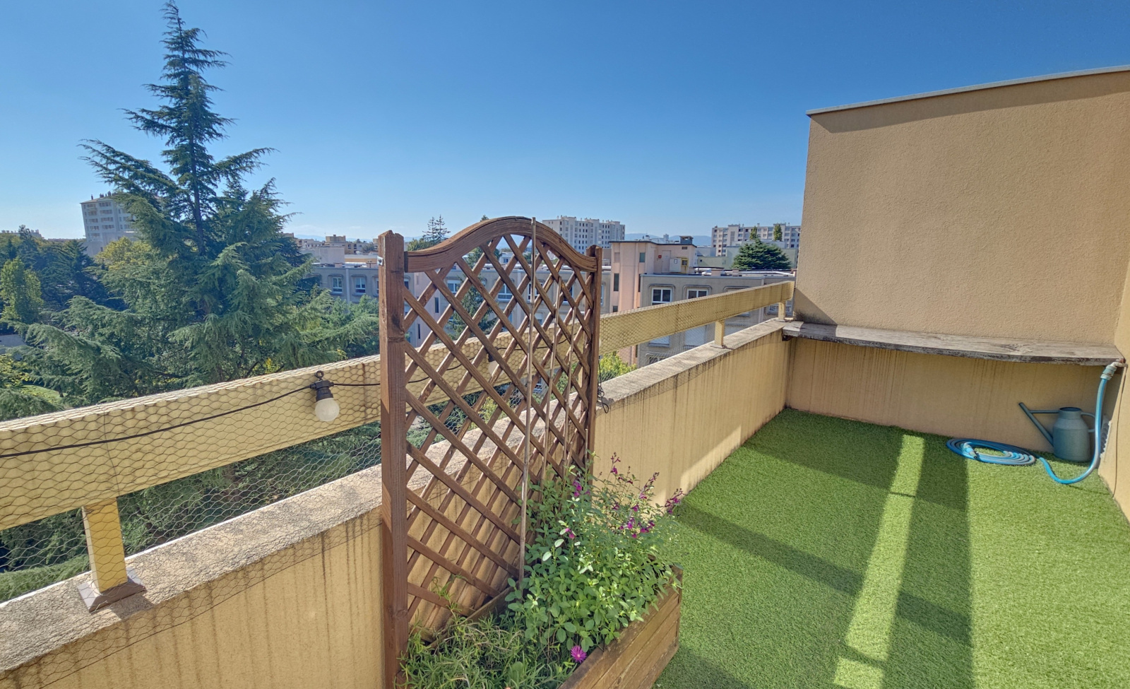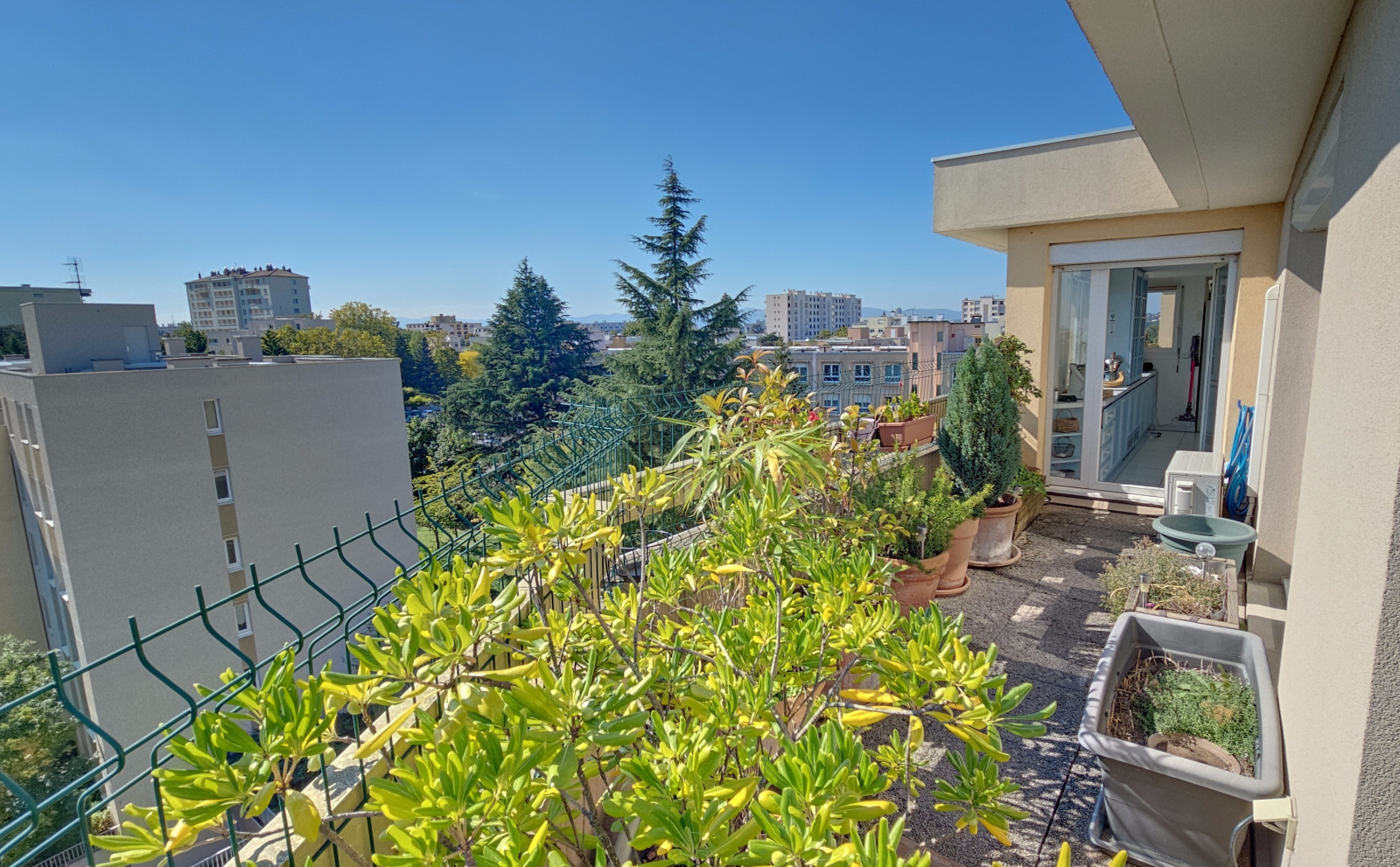 Avec plus de 32 m² de terrasses orientées Sud-Ouest sur les jardins intérieurs et sans aucun vis-à vis, il jouit d’une position dominante et d’une vue panoramique sur Fourvière, Lyon et la chaine des Alpes.