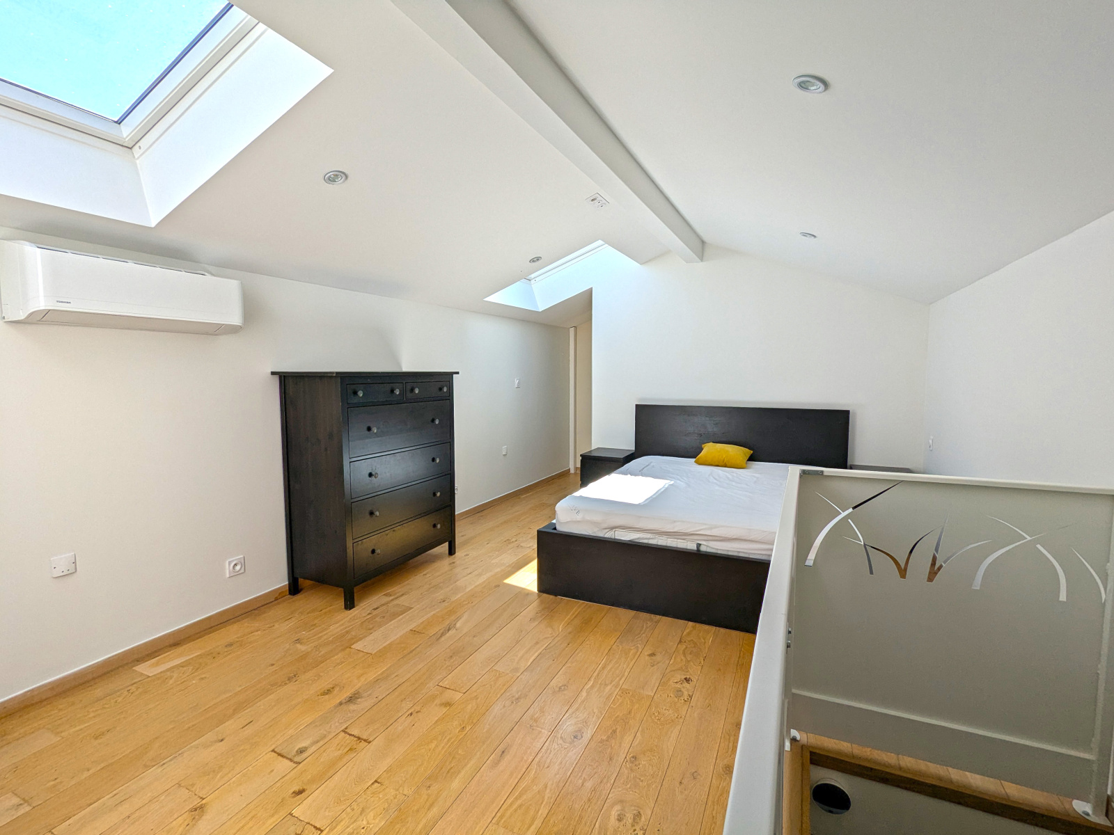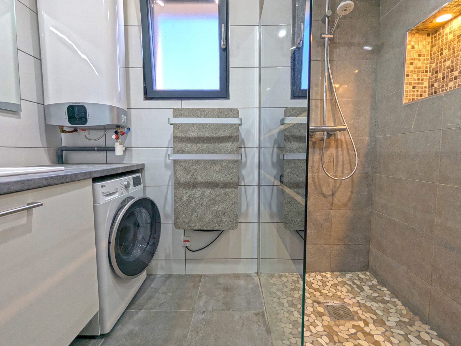 - Le 1er niveau accueille une chambre avec grand placard, une salle de bain avec douche à l’italienne et emplacement machine à laver et un second cabinet de toilette.
