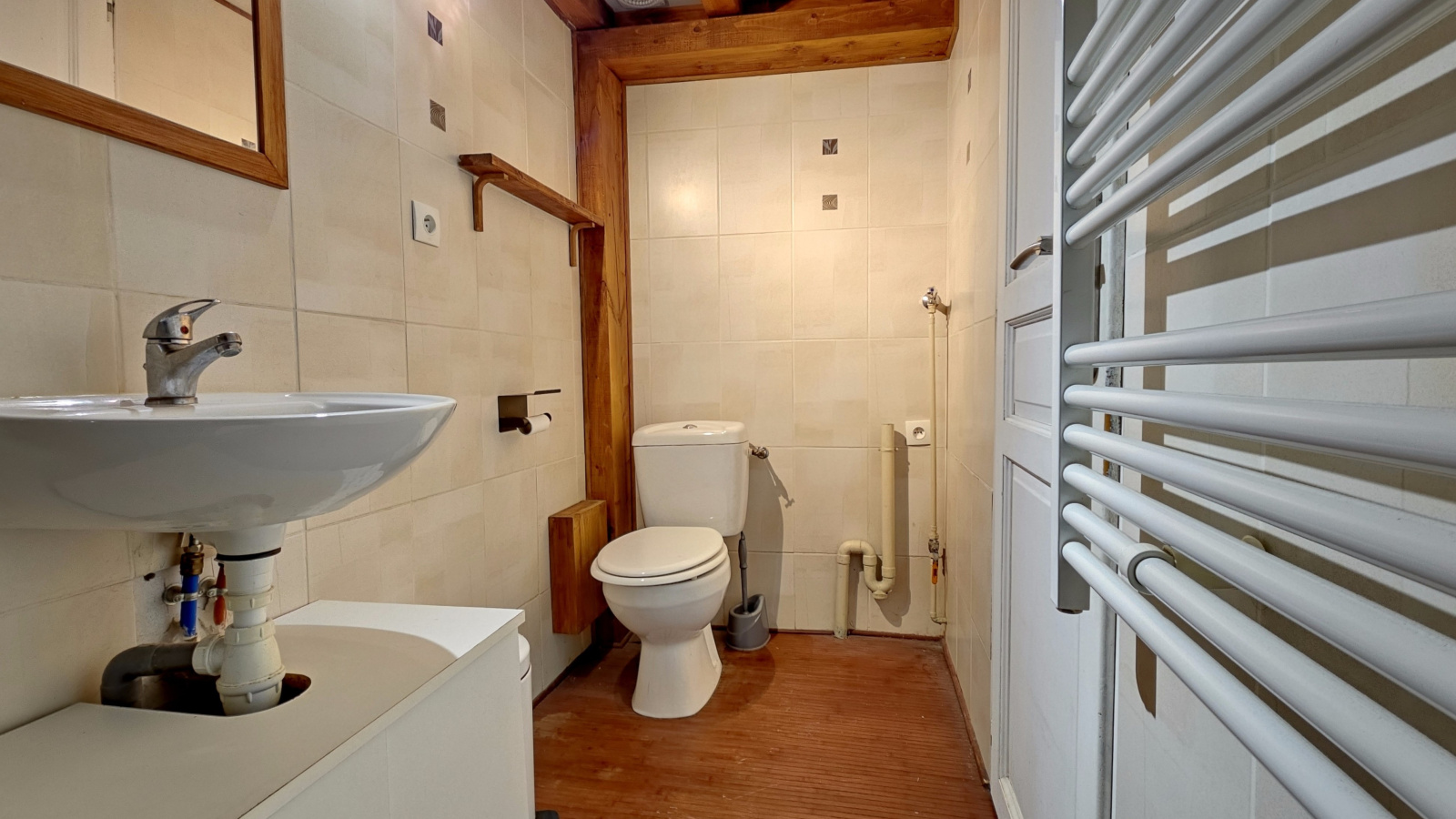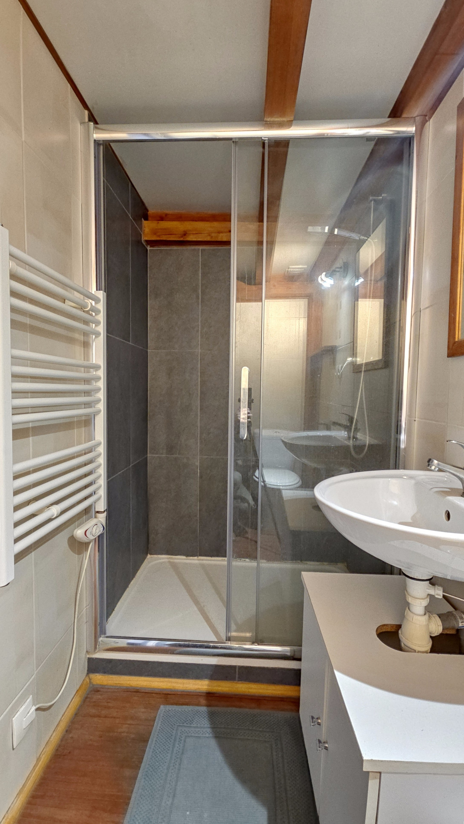 La salle d’eau comporte une douche, un lavabo avec vasque et meuble de rangement, un sèche serviette, un emplacement machine à laver et des WC.