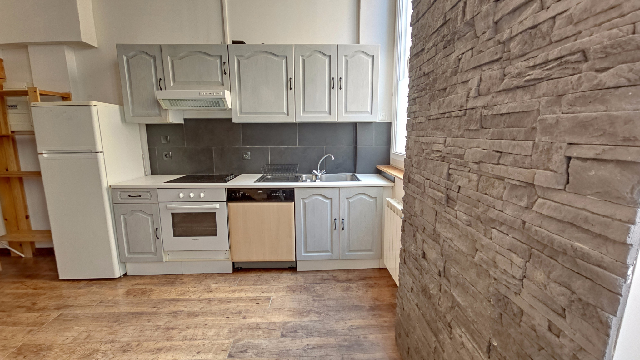 Orienté Sud-Ouest, cet appartement se compose d’une entrée, d’une pièce de vie composée d’un espace salon et d’une cuisine meublée et équipée bénéficiant d’une belle luminosité grâce à deux grandes fenêtres double vitrage avec volets roulants électriques.